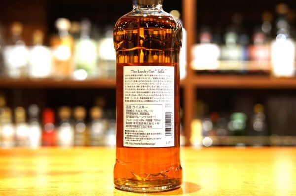 k.Hombo「6月中旬、雨模様の日曜日、妻から連絡がありマロンクリーム色のかわいい仔猫がわが家にやってきた。「道路わきの植え込みの中で泣いていて、母親とはぐれたのかな・・」との事であった。獣医師に診てもらったところ、♂で生後2ヶ月ぐらいとの事。久しぶりの男の子である!大空で輝く太陽のように育って欲しいと「SOLLA(ソラ)」と名付けた。我が家の一員となり4ヶ月ほど経ち良く食べ元気に育っているが、先住のお姉様方に認めてもらえるのはもう少し先になりそうである・・(笑)。そんなソラの毛色やまだまだやんちゃな性格をイメージした、栗樽熟成原酒とスパニッシュオーク・シェリー樽熟成原酒由来の味わいが特徴的なブレンデッドウイスキー。」