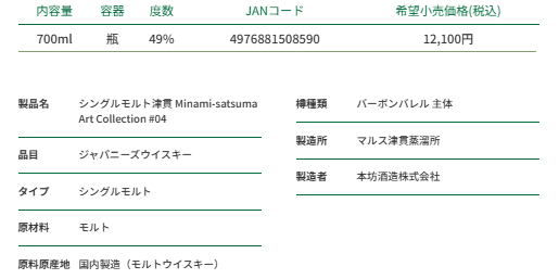 | 希望小売価格 | 蒸溜所限定販売12,100円 ふるさと納税返礼品額43,000円 |