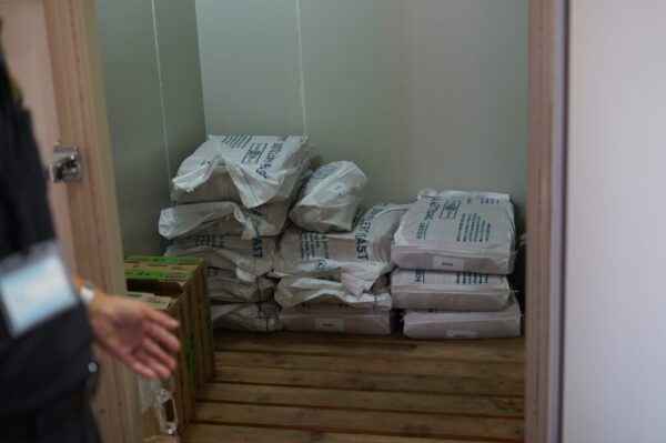 原料はポールズモルト社製を月1~2回、計15トンほど受け入れ、巨大な場内サイロで保管。