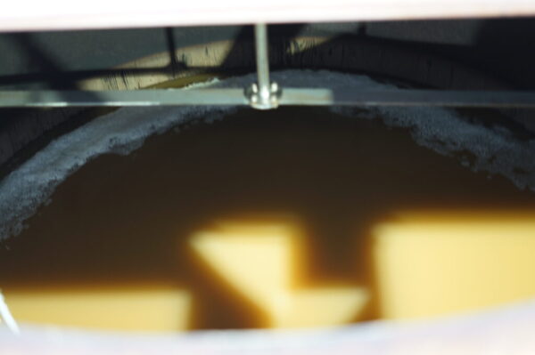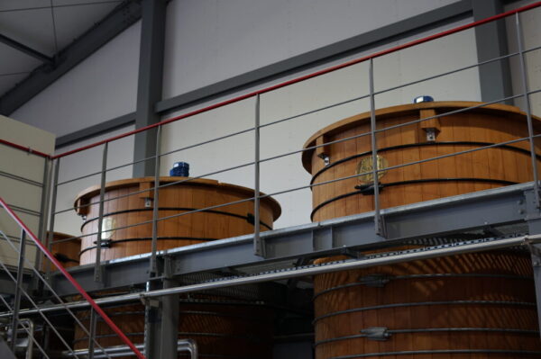 発酵槽は日本木漕社製のカナダ産ダグラスファー。節の少ない木材を輸入し現地組み立て。木桶には発酵に有用な菌が棲みつく。発酵時間は昨年72時間から今年は96時間に延長。ただし「72時間の方がスタイルに合うかもしれない」とも。発酵は10〜30時間でピーク、35〜50時間で終了し、その後は乳酸菌発酵段階に移ると佐々木氏は語る。