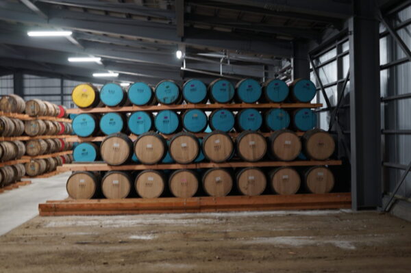 熟成庫は蒸溜所横と鳥海山麓に2棟あり、計約4000樽を保管。一目で識別できるように樽は鏡板の色で管理されています。(白=1st fill、青=2nd fill、赤=3rd fill、黄=4th fill)。